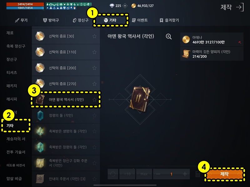 제작 메뉴에서 기타 -> 기타 ->"아덴 왕국 역사서(각인)"을 제작합니다. 제작 재료는 "아데나 100만 + 마력이 깃든 양피지 200개"입니다. 아덴 왕국 역사서 1개당 이벤트 컬렉션 1개를 등록할 수 있으니 총 3개의 역사서가 필요합니다. (하지만 HP100 컬렉션은 사냥만 하는 유저라면 굳이 필요하지는 않으니깐 명중1 / 모든데미지 1 두 개의 컬렉을 우선으로 하는게 좋아보입니다.)