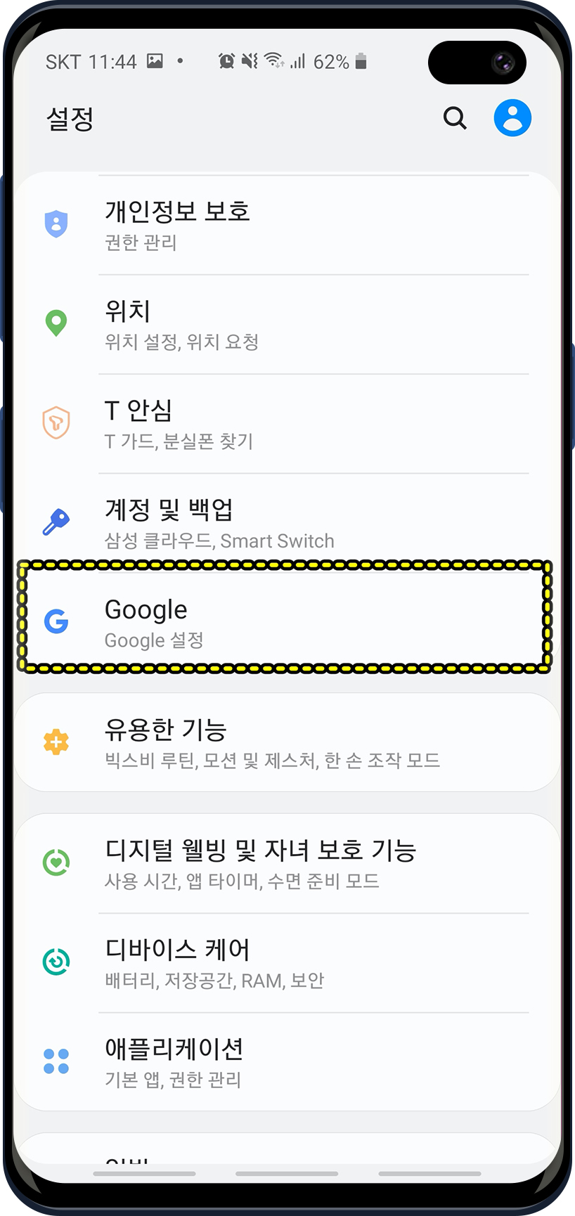 스마트폰의 설정에서 "Google" 메뉴를 선택하고 구글 서비스 중에서 "광고"를 터치합니다.