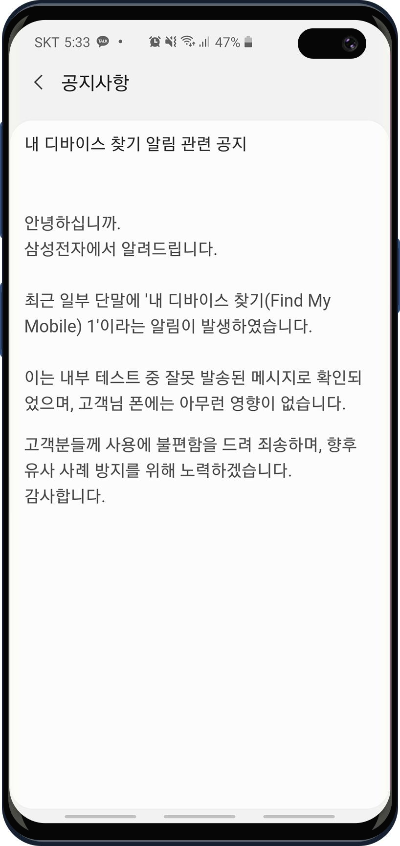 갤럭시 스마트폰 이용하면서 딱히 내 디바이스 찾기 서비스를 이용하지 않았는데 갑자기 "내 디바이스 찾기 find my mobile 1" 이라는 알림이 도착했습니다. 별 신경안쓰다가 조금 불안해서 메세지를 터치하니 알림만 사라지고 다른 화면이 나오지 않더군요.