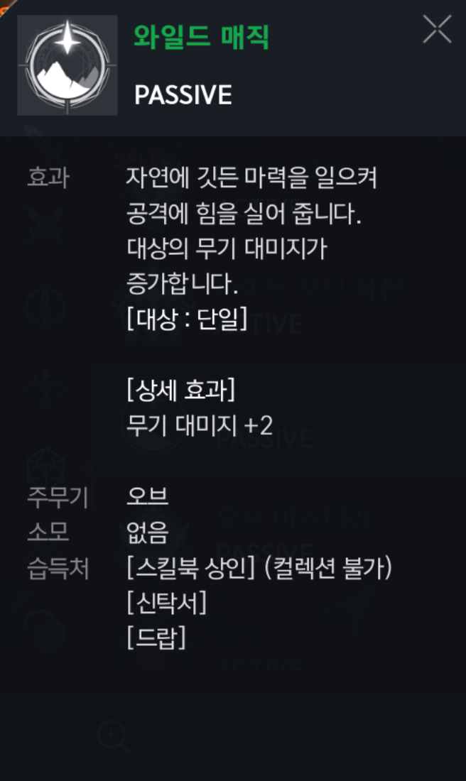 와일드 매직 : (패시브) 스킬은 뭐든 배우는게 좋습니다. 무기 대미지 증가 +2 ▶ 필수◀