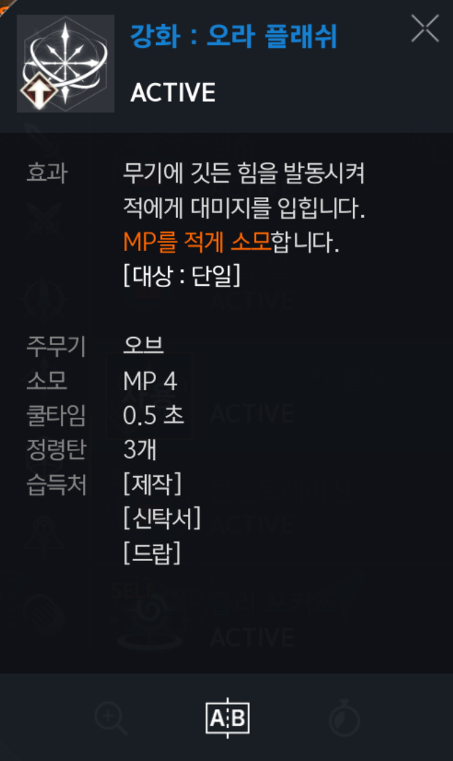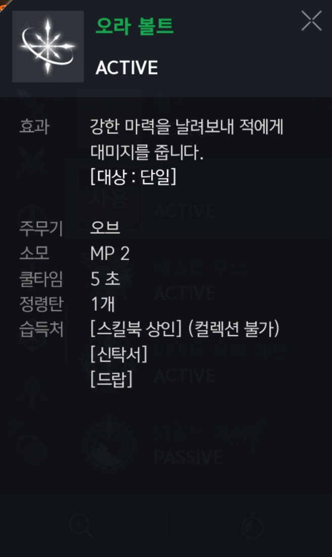 오라 볼트 : 오브는 공격 스킬이 몇개 없습니다. 오라볼트 + 오라플래쉬로 공격합니다. ▶ 필수◀