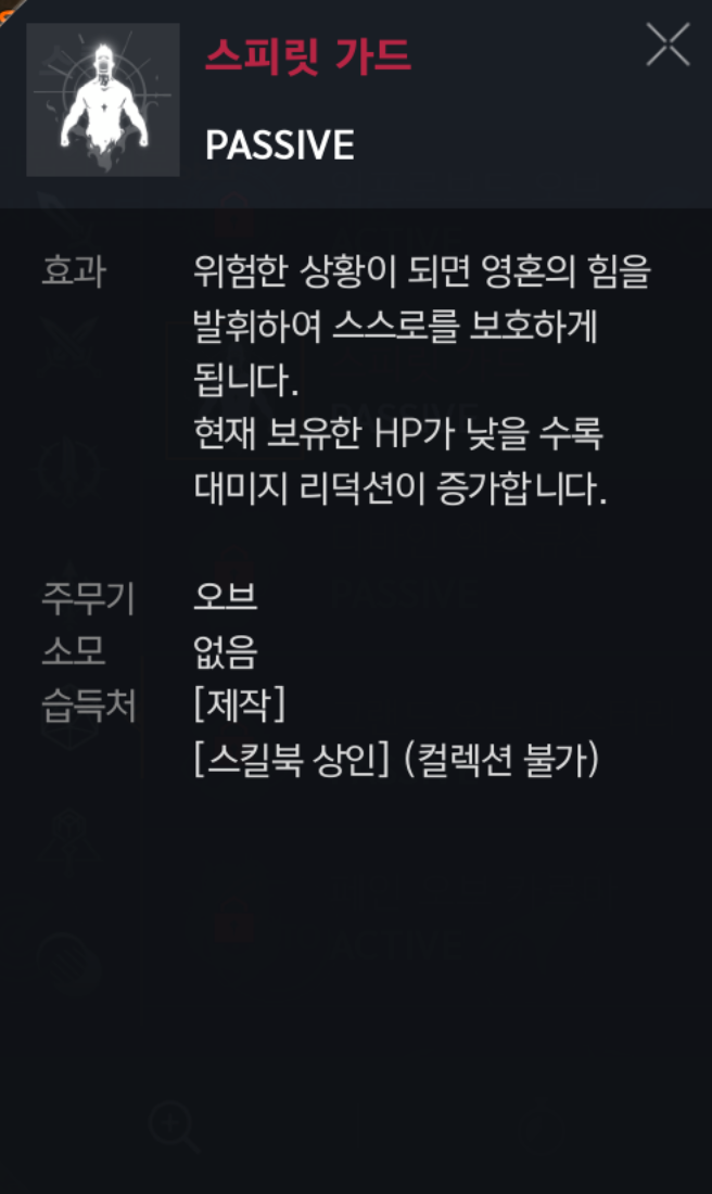 스피릿 가드 : (패시브) 낮은 HP면 대미지 리덕션이 증가하는데 힐 자동 스킬이 있어서 지금은 "리덕션+4" 효과를 보는걸로 생각하면됩니다. ▶ 필수◀