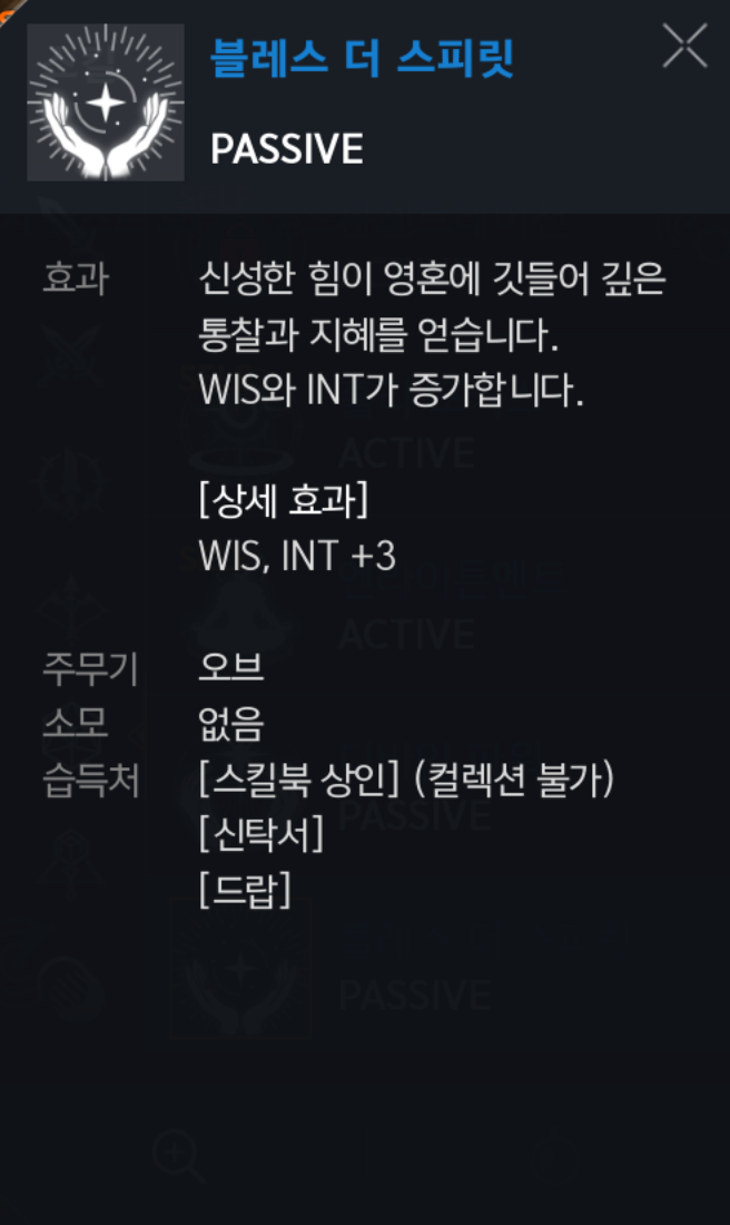 블레스 더 스피릿 : (패시브) 위즈,인트 +3 스탯올려주는데 당연 ▶ 필수◀