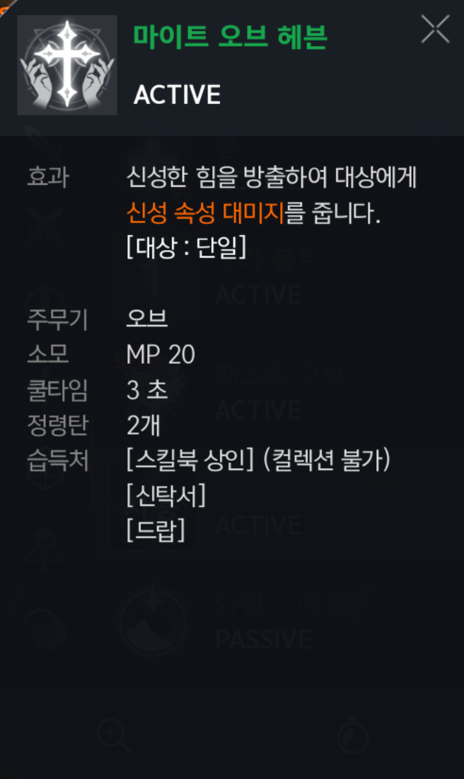 마이트 오브 헤븐 : 신성 속성 대미지를 주는 스킬인데 잘 사용하지 않습니다.
