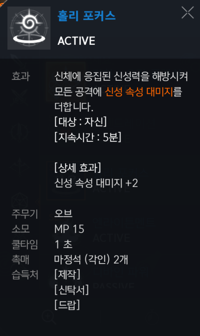 홀리 포커스 : 신성 속성 대미지 +2 데미지 올려주는다 당연하게 ▶ 필수◀
