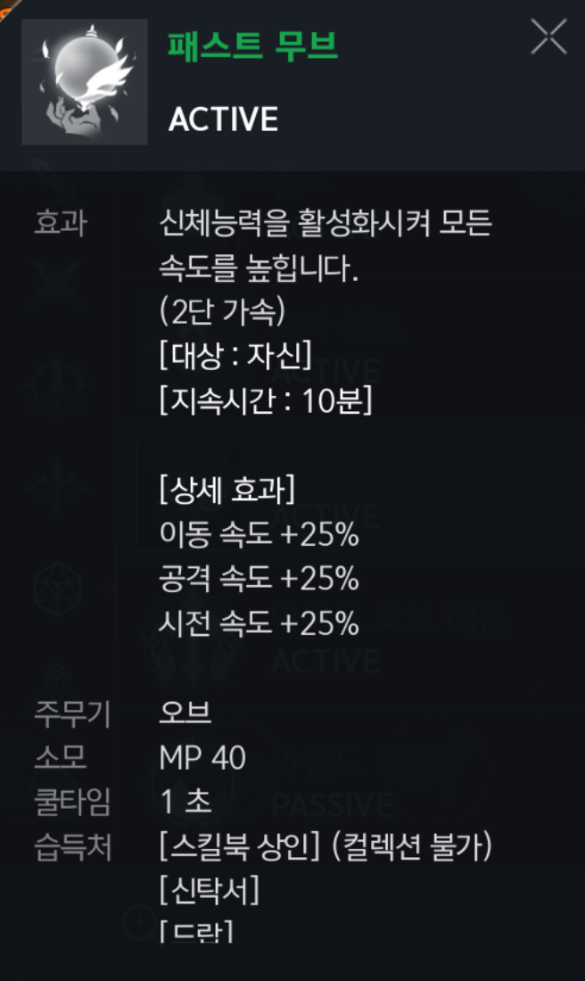패스트 무브 : 이속,공속,시속 25%올려주는 스킬입니다. ▶ 필수◀