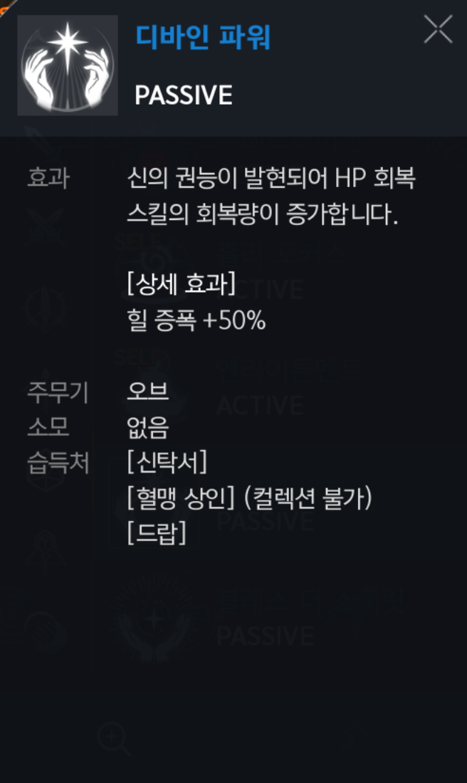 디바인 파워 : (패시브) 힐러에게 힐 증폭은 필수겠죠 ▶ 초필수◀