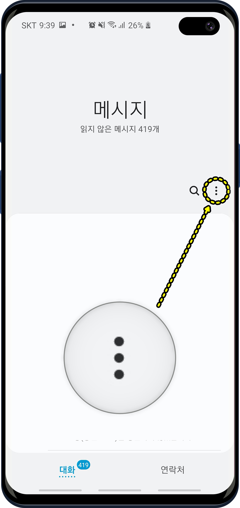 스마트폰의 문자함에서 메뉴 혹은 점3개의 아이콘을 눌러 메세지의 설정 옵션으로 진입합니다.
