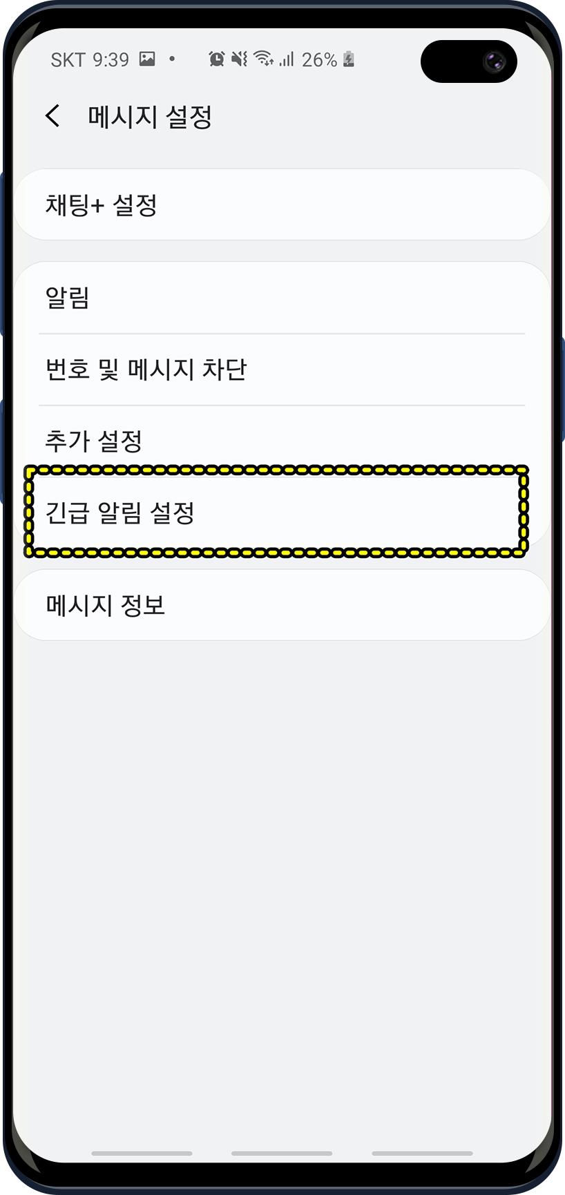 ▶ 갤럭시 문자함 -> 점3개 메뉴 버튼 -> 설정 -> 긴급 알림 설정