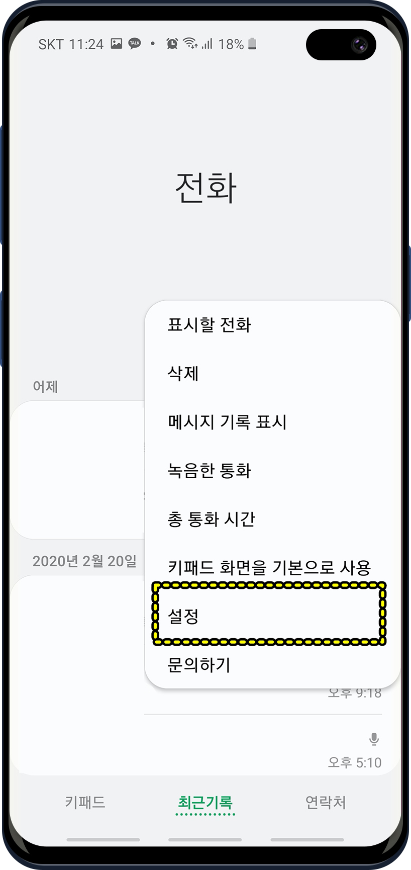 스마트폰의 통화 앱에서 메뉴 또는 3개의 점으로 된 아이콘을 눌러서 통화 설정 메뉴에 진입합니다.