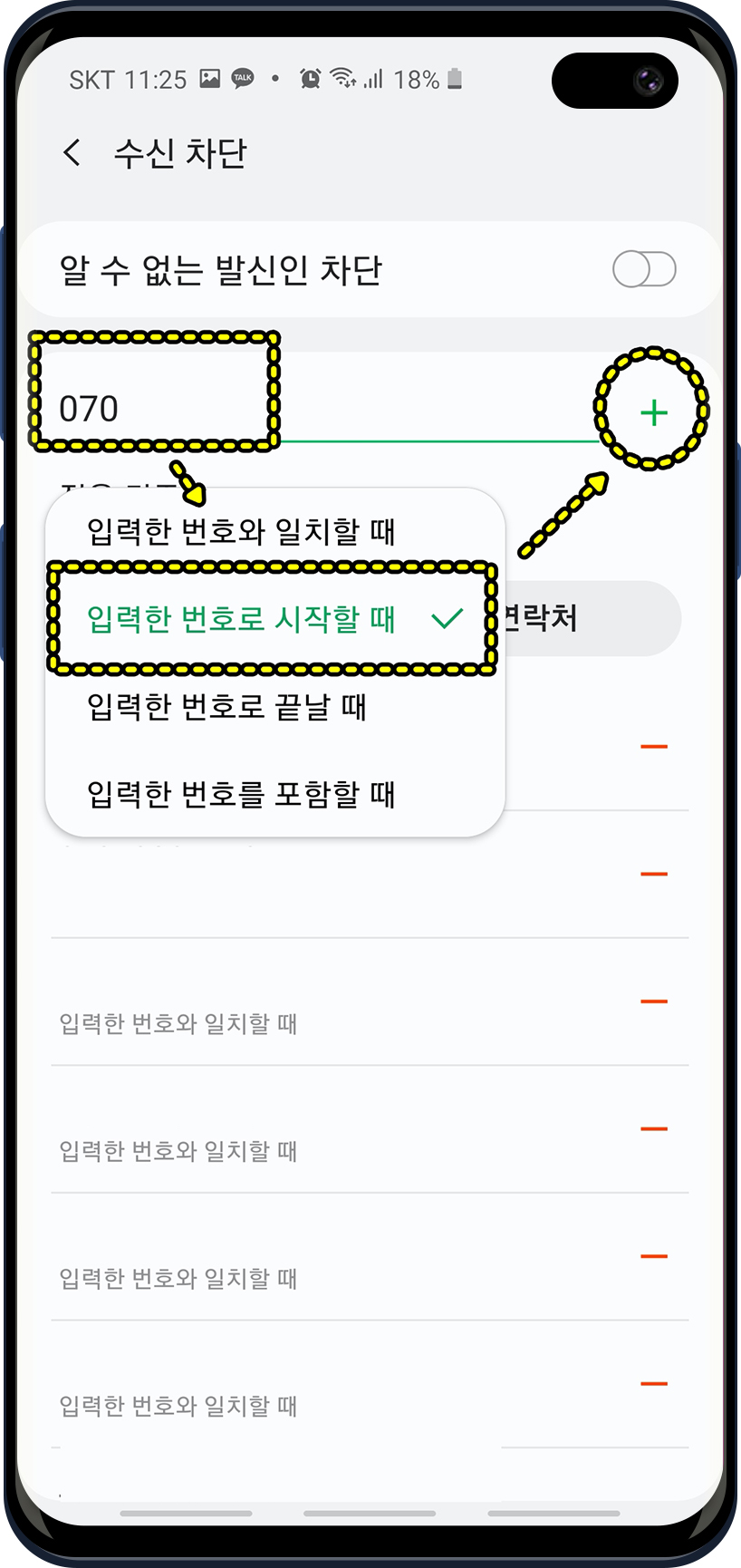 그리고 설정을 완료하려면 " + " 아이콘을 눌러서 등록을 시켜야합니다. 특정 번호만 차단하려면 옵션에서 "입력한 번호와 일치할 때"를 선택해야합니다.