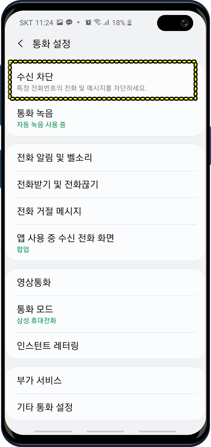 기기마다 설정의 차이는 있겠지만 갤럭시 종류의 스마트폰들은 대부분 070 (아니면 특정 다른 번호도) 차단 설정이 비슷비슷합니다.
