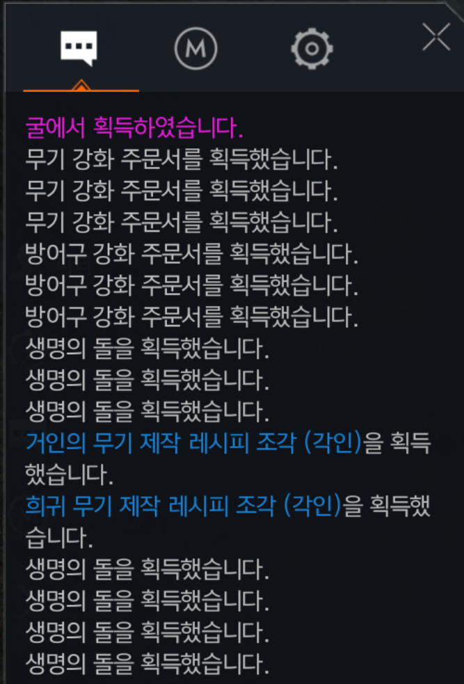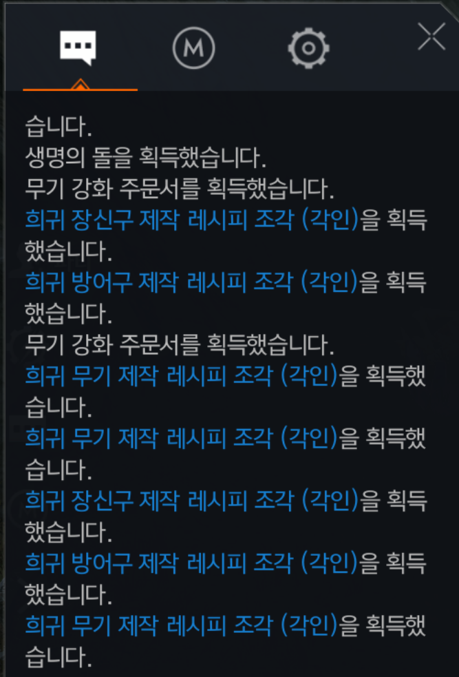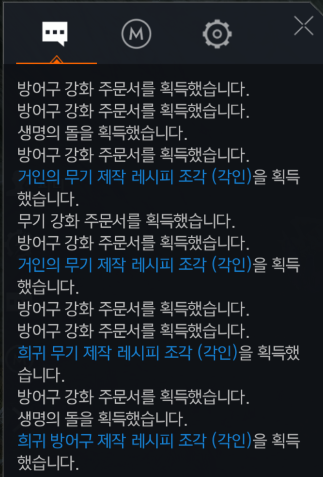 생명의돌 10개 / 무기 강화 주문서 8장 / 방어구 강화 주문서 10장 / 희귀 레시피 13장 요렇게 나왔네요. 생명의 돌과 무기,방어구 주문서들은 모두 거래소에 등록해서 판매올렸습니다.