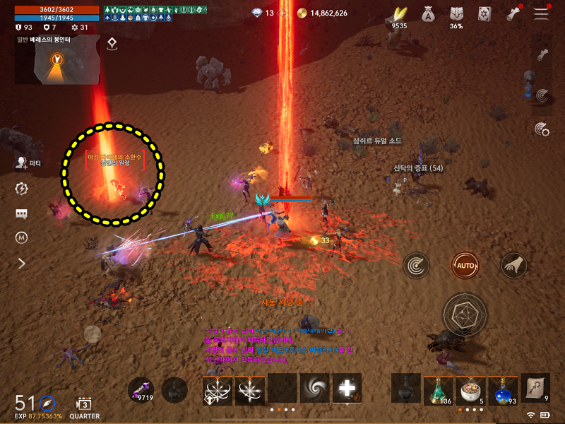 마검 자리체가 소환되었다는 메세지가 출력되면 맵을 열어서 소환된 지역으로 빠르게 이동합니다. 이때 저는 "매너모드, 사냥 반경 20MM" 으로 설정하고 마검 자리체 기둥 중앙에서 오토 버튼 눌러 놓습니다. 수동으로도 해봤는데 크게 차이는 없더라구요. 그냥 마음 편하게 오토로 돌려서 보스몹이 나오기 전에 쫄몹들을 사냥합니다.