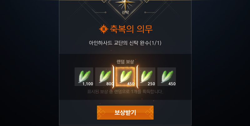 상점에서 구매한 교단의 신탁서는 보상이 모두 "아인하사드의 은총"입니다. 1,100짜리 보상이 있으면 그걸로 퀘스트 정해서 진행하는편입니다. 사진은 이렇지만 은근 1,100 은총 보상 잘걸려서 필수입니다.