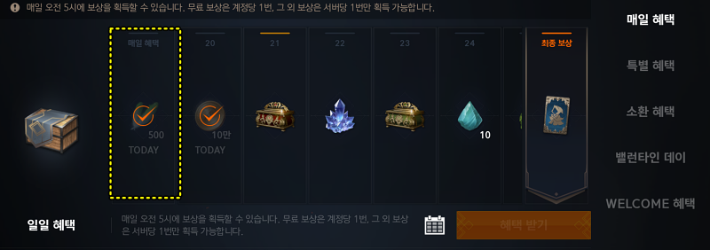 다른말로는 출석부죠. 데일리 보상에서 하루에 한번씩 고정으로 아인하사드를 획득할 수 있습니다 ( 500 충전 )