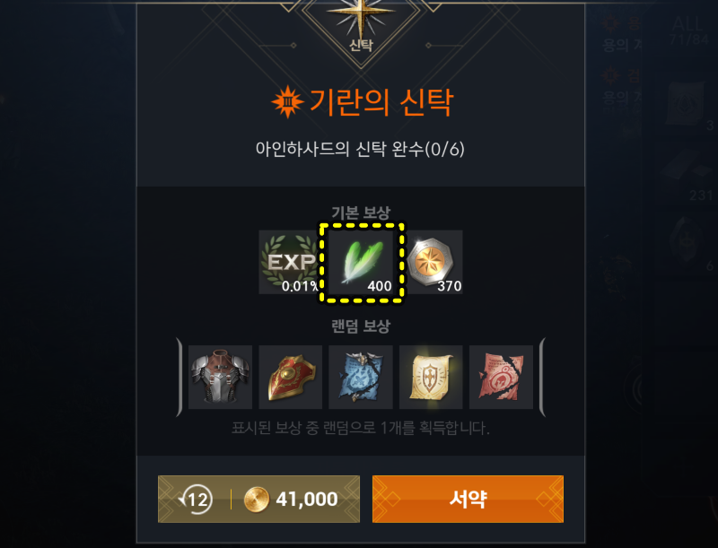 이렇게 만들어진 신탁서를 사용해서 퀘스트를 진행하면 보상으로 경험치,아인하사드의 은총 400,신탁의 증표를 기본 보상으로 주고 기타 아이템들 획득이 가능합니다.