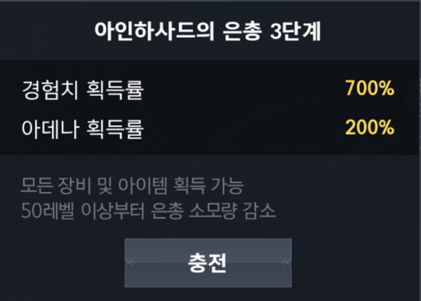 아인하사드의 은총은 총 3단계로 구성됩니다. 1단계는 아인하사드의 은총이 0인 상태를 의미하며 경험치와 아데나 획득률은 100%이지만 거래소에 등록이 가능한 아이템 즉 비각인 장비들은 획득이 불가능합니다.