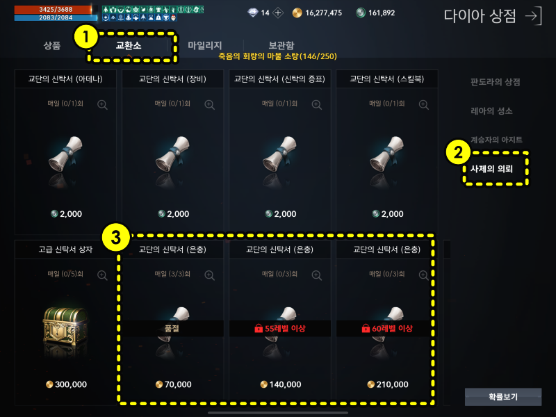 4.상점 교단의 신탁서 (은총) 진행 (55레벨 / 60레벨이상 추가 구입)