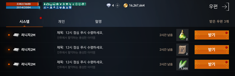 특별한 이벤트가 아니라면 푸쉬 우편으로 하루에 4번의 아인하사드를 보급(?)합니다. 유저들은 이를 사료라고 부르며 가장 편하게 아인하사드를 모을 수 있는 방법이죠. ( 총 3,000 아인하사드 충전)