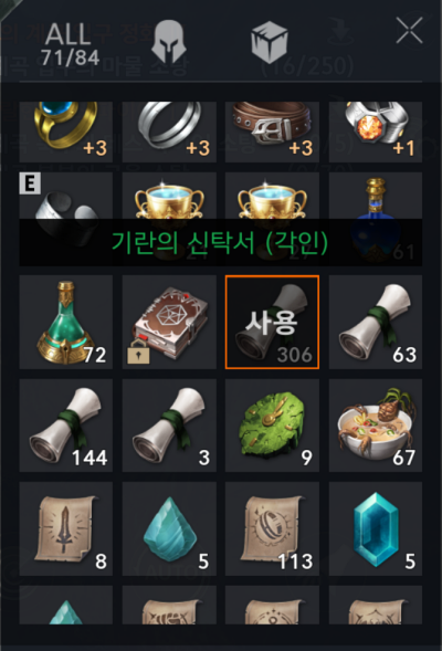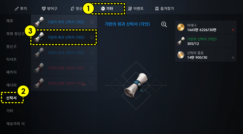 하지만 게임을 플레이할 혹은 수동으로 할 시간이 많이 부족하다면 이렇게 쌓인 기란의 신탁서를 => 희귀 신탁서로 제작해서 사용하는 방법이 있습니다.