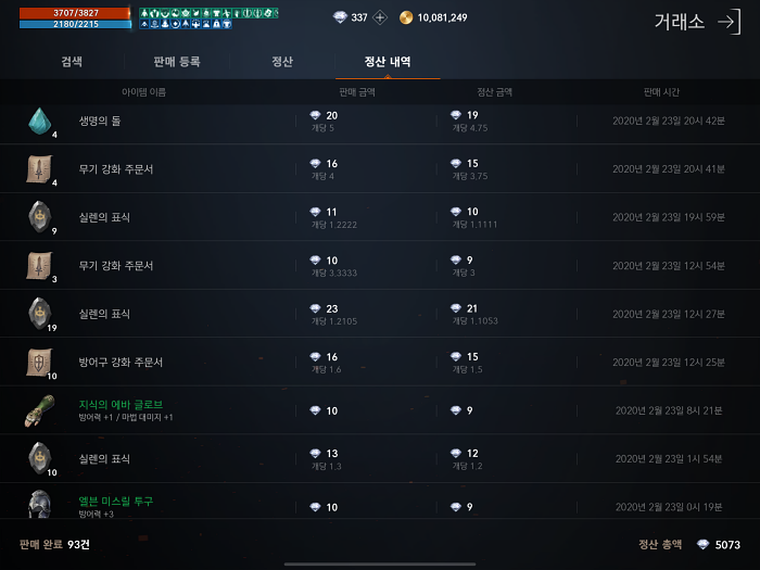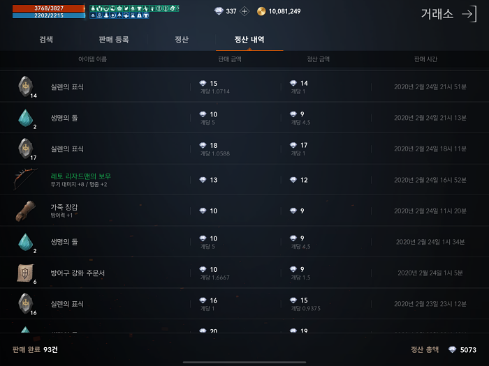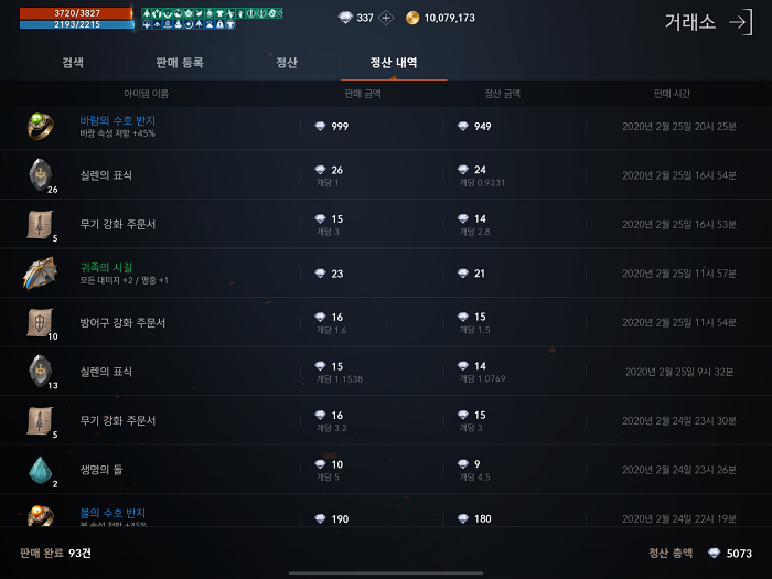 거래소 정산 내역인데 조금씩 계속 팔아서 판매 완료는 많지만 정산 금액이 5000다야정도로 매우 허접합니다. 대부분의 "마검 자리체"에서 잡템들 먹어서 판매했고 가끔 아주 가아끔 용계 북부에서 희귀 아이템 먹어서 판매한거 말고는 진짜 폐지 주워서 근근히 살아가고 있습니다.