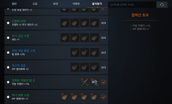 컬렉션들 하나씩 채워넣고 있습니다. 비싼 아이템을 구매해서 스펙을 올리는 방법은 무과금에게 있을 수 없는 일이라서 이렇게 등록할 수 있는 컬렉션들은 등록해서 조금씩 스펙을 올리는게 좋습니다. 이번 포스팅 작성하기 전에 몇개 더 등록했는데 자료로 남은거는 "마법 치명타 +1%"와 "MP 회복 +1 "입니다.