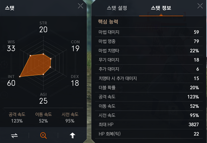 기존에 작성했던 게시물은 55 마법 대미지와 75 명중인데 지금 마법대미지는 55-> 59로 명중은 75->79로 올라갔습니다. 명중이 4 올라간 이유는 앞에서 반지 2개를 3짜리에서 4짜리로 업글해서 명중 2가 추가됐고 남은 명중 2는 신규 업데이트로 정령각인 "투지"를 상승시켜 명중 + 대미지가 2씩 상승했습니다.