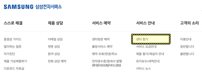 삼성전자서비스 홈페이지에서 "서비스 안내 -> 센터 찾기" 메뉴로 이동합니다.