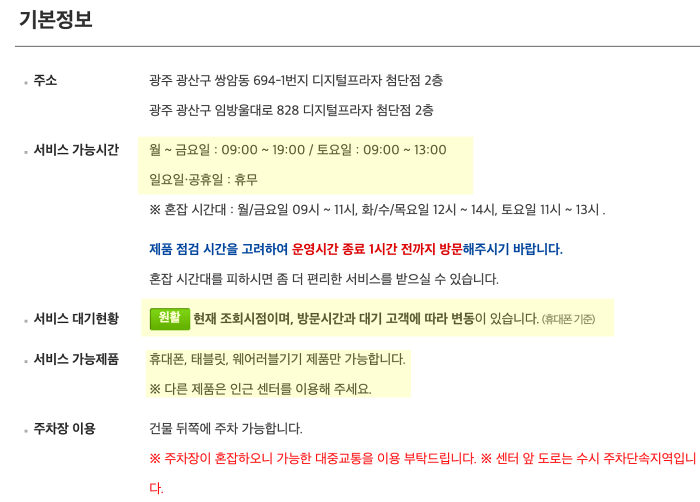주의할 부분은 앞에서도 말했지만 서비스 가능제품들이 센터마다 조금씩 차이가 있습니다. 지금 제가 조회산 삼성서비스센터는 "휴대폰,태블릿,웨어러블기기 제품만" 가능합니다. 해당 센터에 노트북 들고 갔다가는 시간만 버리니깐 미리 서비스 가능 제품을 확인하고 가는게 좋습니다.