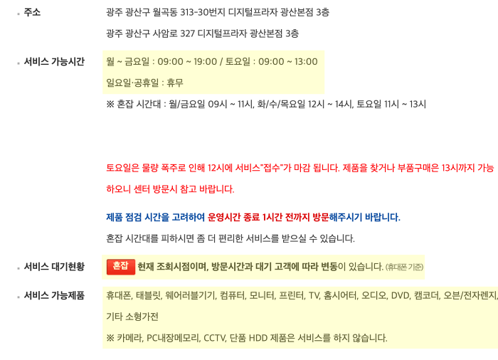 삼성 서비스 센터 방문 전에 꼭 홈페이지에서 방문하려는 센터의 운영시간과 "서비스 가능 제품"을 확인해서 귀중한 시간 낭비하는 일이 없으면 좋겠습니다 :-)