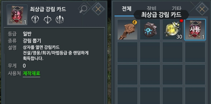 "보상 받기"를 눌러서 인벤토리에 들어온 "최상급 강림 카드"를 사용합니다. 대부분은 고급 등급이 나오고 가끔 희귀가 나오더군요. 아직 영웅등급의 강림카드는 받지 못해서 아직도 리세마라하고있습니다. 계정이 많이 있는게 아니라 2~3계정으로 해보고 아니면 그만 할 각이군요 ㅋㅋㅋ