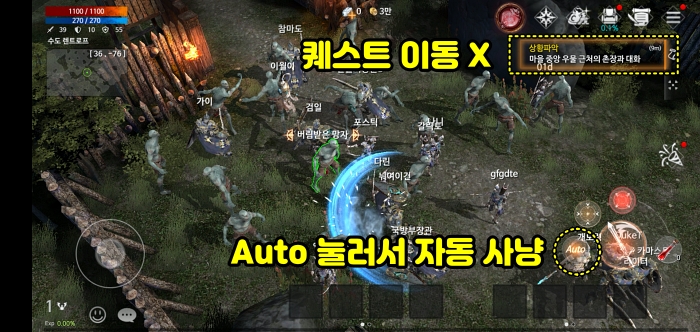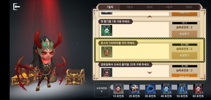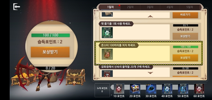 1일차 퀘스트를 밑으로 내려보면 "몬스터 100마리를 처치 하세요." 퀘스트의 숫자가 점점 올라가는 것을 확인할 수 있습니다. (버림받은 망자를 오토 눌러서 계속 잡고 있어야합니다.