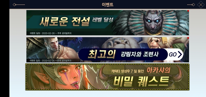 캐릭터 생성 후 7일 동안 "아카샤의 비밀 퀘스트" 이벤트가 있습니다. 미션을 수행하면 아이템을 주는 이벤트인데 여기서 "몬스터 100마리 처치" 미션을 수행하면 "최상급 강림 카드"를 보상으로 줍니다. 보상을 사용하면 "전설/영웅/희귀/마법"등급의 강림 카드를 랜덤하게 받게되는데 이 이벤트로 리세마라를 합니다.