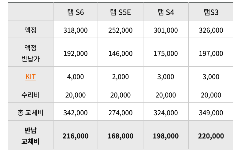 KIT는 액정이나 메인보드 등의 부품들은 교체시 같이 교체가 필요한 필름같은 부품입니다. 스마트폰의 경우는 KIT 비용이 일정했는데 패드는 모델마다 금액이 조금씩 차이납니다. 그외의 공임비 (수리비)는 20,000원으로 동일하구요. 파손된 액정을 반납하면 "삼성 갤럭시 탭 S6의 액정 수리비용은 216,000원" 입니다.