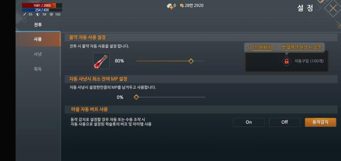이것저것 누르다가 보니깐 잠깐 메뉴들이 보입니다. 바로 "전투" 부분을 꾹! 누른상태로 오른쪽으로 드래그하면 화면이 떨리면서 숨겨진 메뉴들이 보입니다. 해상도나 뭐 그런 문제로 조작/환경/알림/정보 부분의 탭 메뉴들이 출력되지 않았나봅니다.