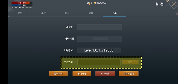 드래그해서 오른쪽으로 손가락을 민 상태를 유지하면서 "정보"탭을 누르면 정상적으로 쿠폰등록할 수 있는 메뉴로 이동합니다. 이렇게 쿠폰 등록하기 어려운 게임도 처음이네요.