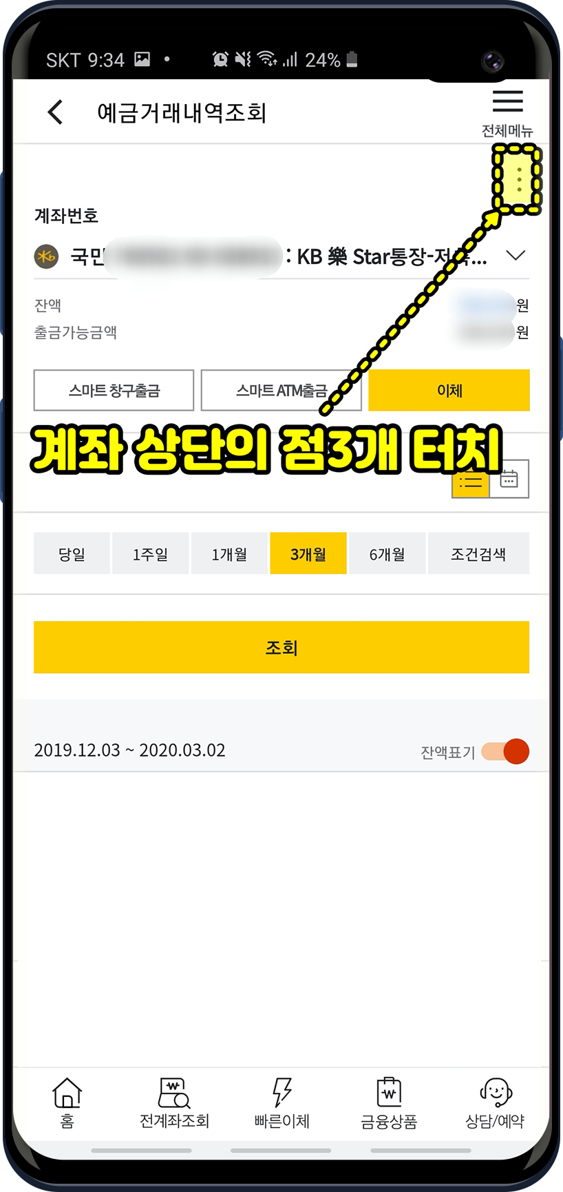 국민은행 어플에 로그인해서 통장사본을 출력하고 싶은 계좌를 선택합니다. 예금/적금에서 하나 골라서 터치하면 "예금거래내역조회" 페이지로 이동합니다. 여기에서 계좌번호 우측 상단의 "점3개"를 누릅니다. 요게 메뉴 버튼이라서 누르면 메뉴가 나타납니다.