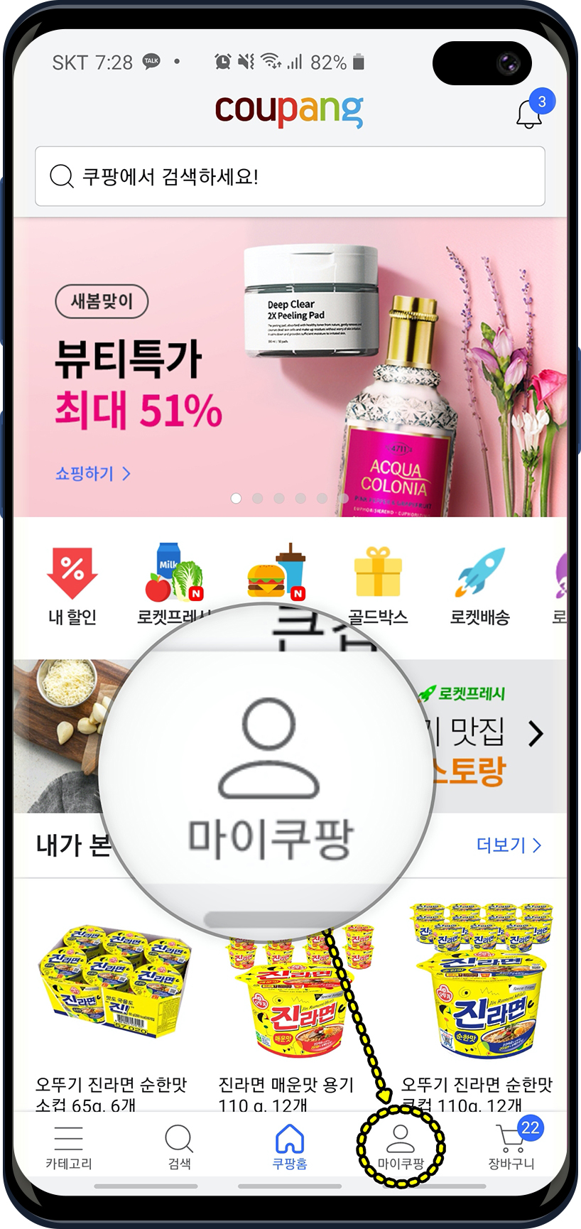 피씨나 모바일이나 비슷하지만 주로 모바일을 이용하니 쿠팡 모바일 앱에서 해지하는 방법을 소개합니다. 앱에서 하단의 "마이쿠팡"을 선택하고 마이쿠팡에서 "로켓와우 멤버십" 메뉴로 이동하면됩니다.