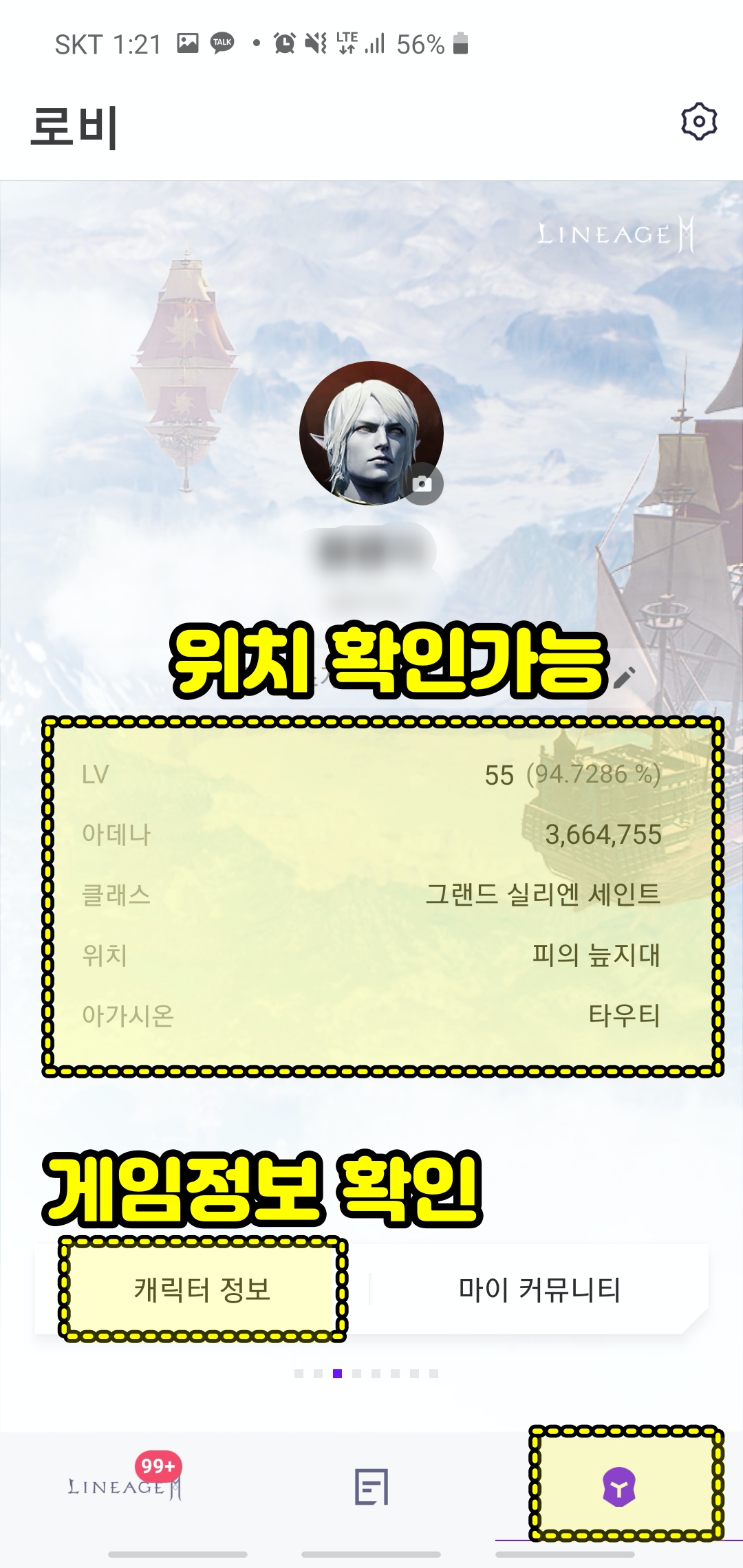 그리고 하단의 아이콘은 서류 모양은 리니지2M 커뮤니티로 이벤트나 각종 정보들이 있는 곳이고 우측의 투구 모양의 아이콘은 "캐릭터 정보 확인"하는 메뉴입니다. 저는 주로 여기 기능이 이용하고있습니다. (채팅을 안하거든요.)