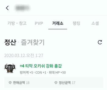 그리고 하단에 위치한 "캐릭터 정보"를 터치하면 조금더 상세한 캐릭터의 정보를 확인할 수 있습니다. 거래소에서 뭐가 팔렸는지. 아니면 PK를 누구에게 당했는지를 말이죠.