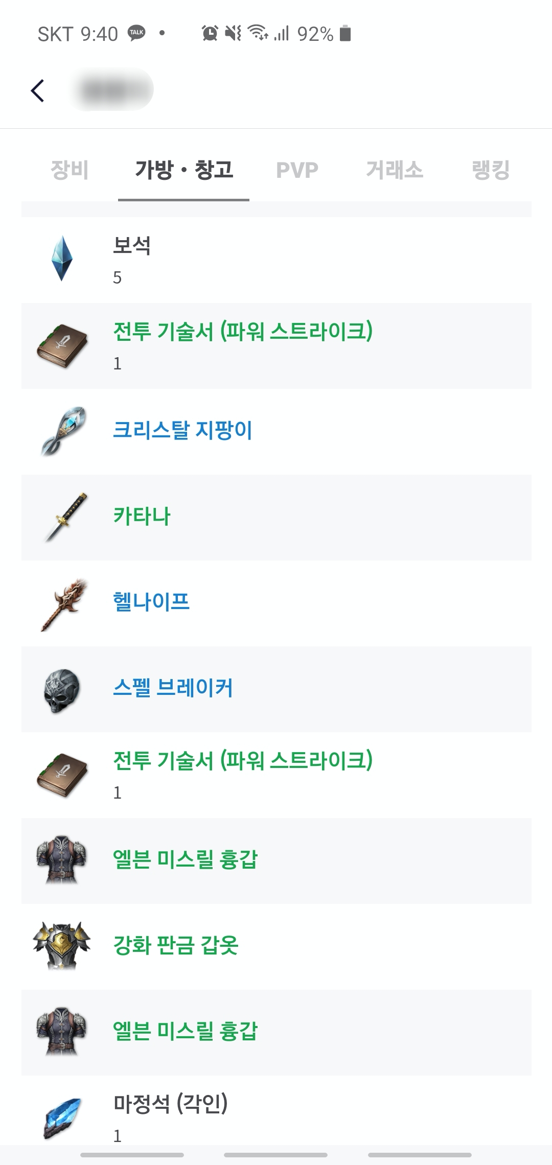 상단의 장비 / 가방,창고 / PVP / 거래소 / 랭킹 탭을 누르면 각각 정보를 확인할 수 있습니다. 장비는 현재 착용하고 있는 아이템들을 확인하는 부분이고 가방과 창고는 말 그대로 가방에 어떤 아이템이 있는지 확인할 수 있습니다.