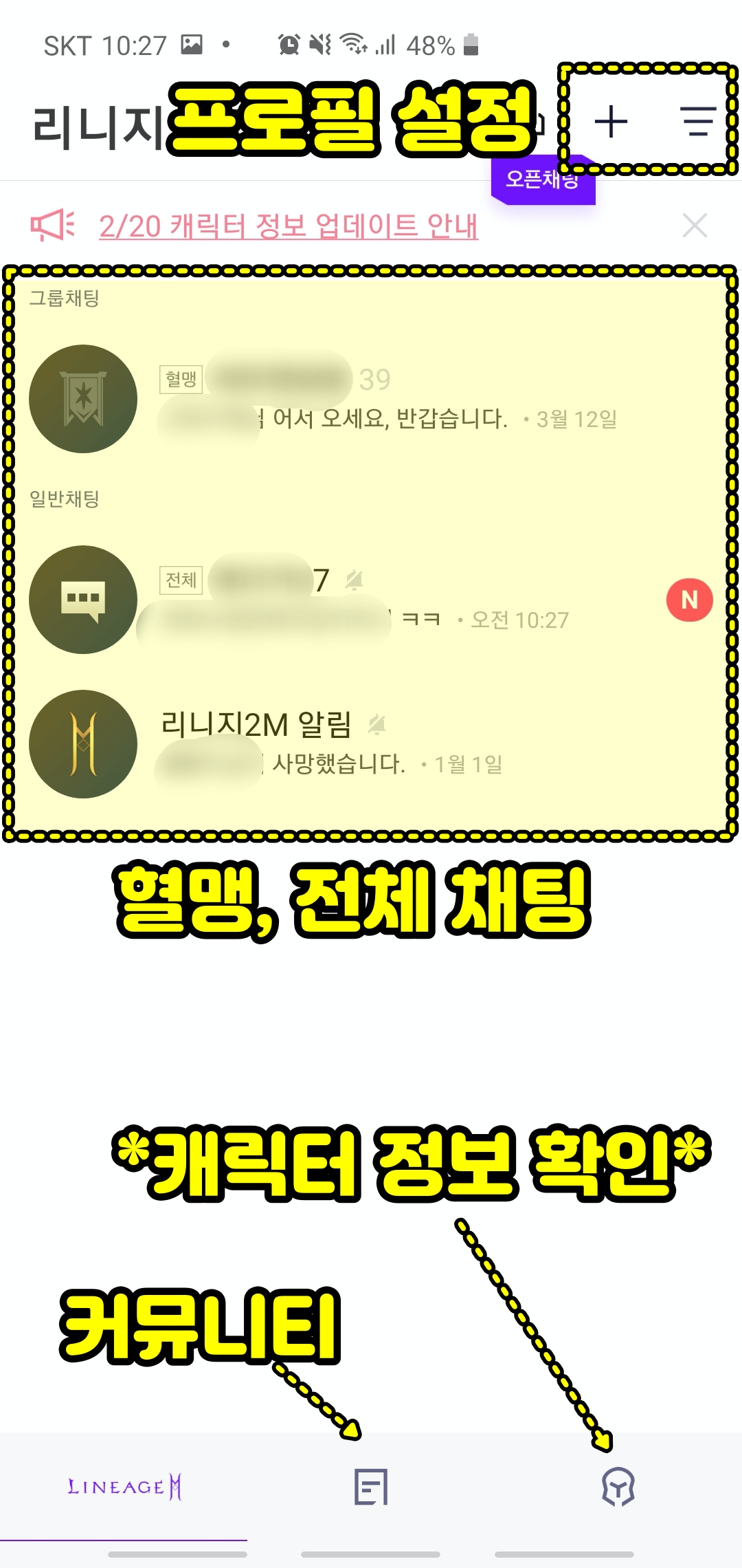 리니지2M의 퍼플 앱에 접속하면 처음에는 가입된 혈맹의 채팅과 하단의 전체 채팅 목록이 보입니다. PC나 태블릿으로 리니지2M을 자동사냥 돌려놓고 "퍼플 모바일 앱"으로 접속해서 따로 채팅만 할 수 있습니다. 굳이 게임 캐릭터로 채팅을 안해도 된다는 말이죠. (우측 상단의 메뉴들 +와 3단줄을 터치하면 프로필 캐릭터를 설정할 수 있습니다.)