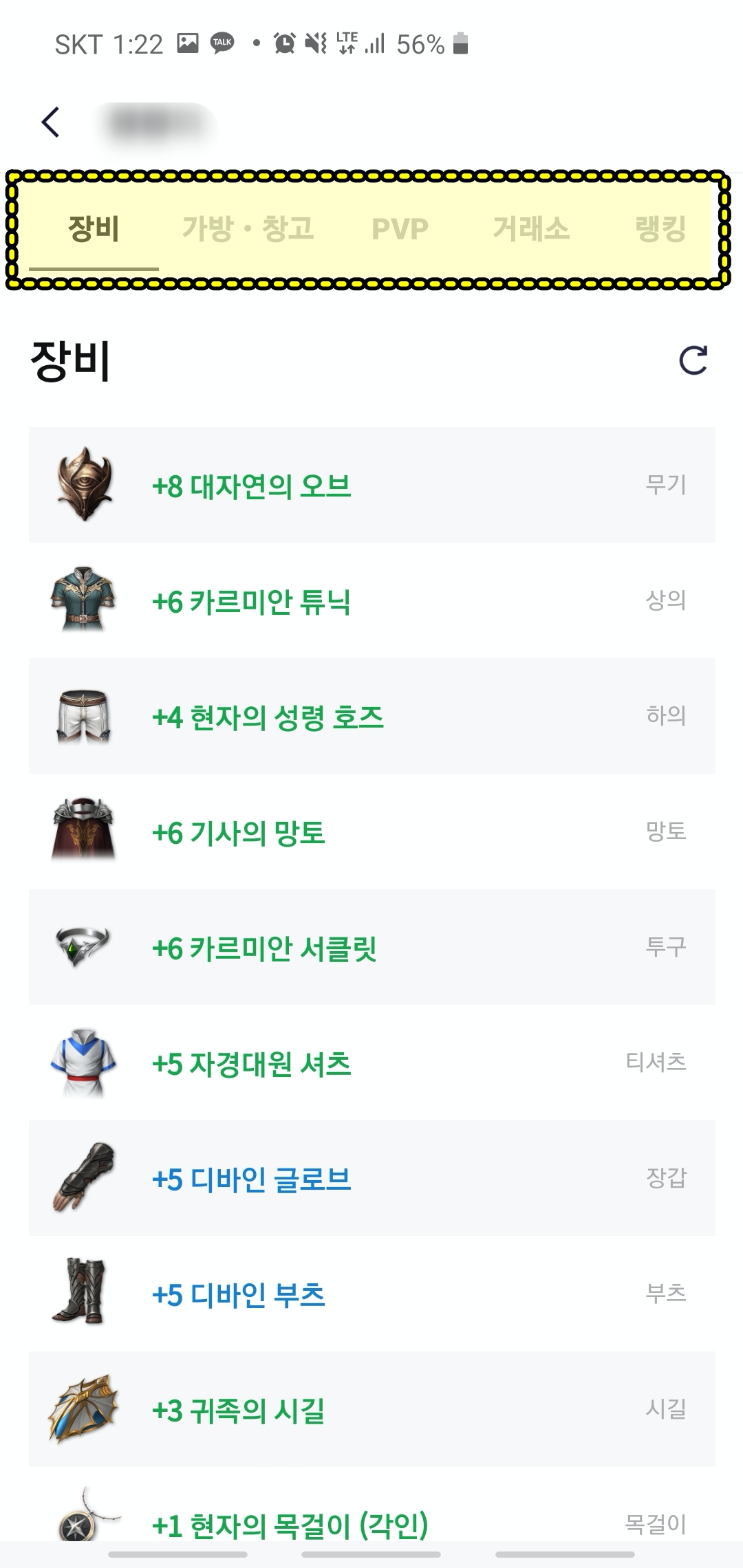 상단의 장비 / 가방,창고 / PVP / 거래소 / 랭킹 탭을 누르면 각각 정보를 확인할 수 있습니다. 장비는 현재 착용하고 있는 아이템들을 확인하는 부분이고 가방과 창고는 말 그대로 가방에 어떤 아이템이 있는지 확인할 수 있습니다.