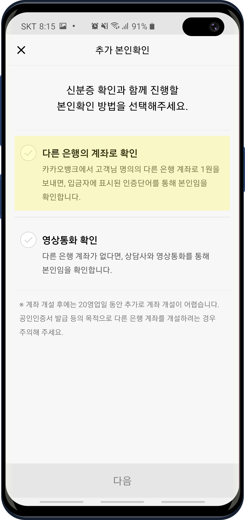 이제 본인확인을 해야하는 단계입니다. 처음에는 신분증을 촬영해서 본인확인하는 방법이고 추가로 계좌나 영상통화를 통해 본인확인을 합니다. 예전 카뱅 가입 정보들을 봤을때는 타은행 계좌가 있어야지만 가입이 가능했었는데 지금은 "영상통화 확인"으로 상담사와 영상 통화를 통해서 본인확인을 진행할 수 있나봅니다. 저는 계좌가 있어서 "다른 은행 계좌로 확인"을 선택했습니다.
