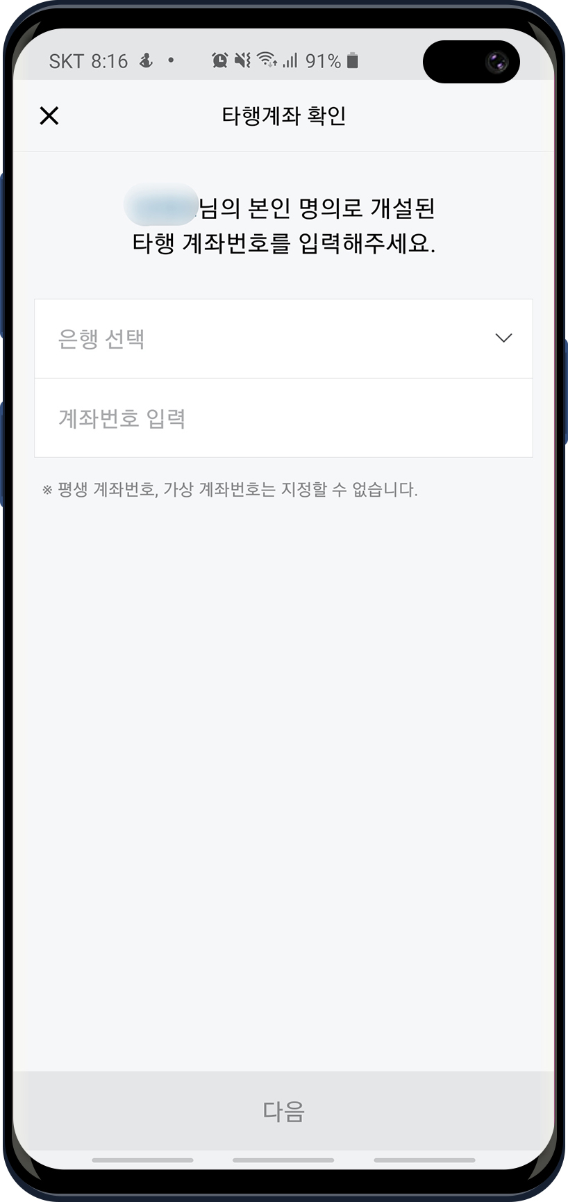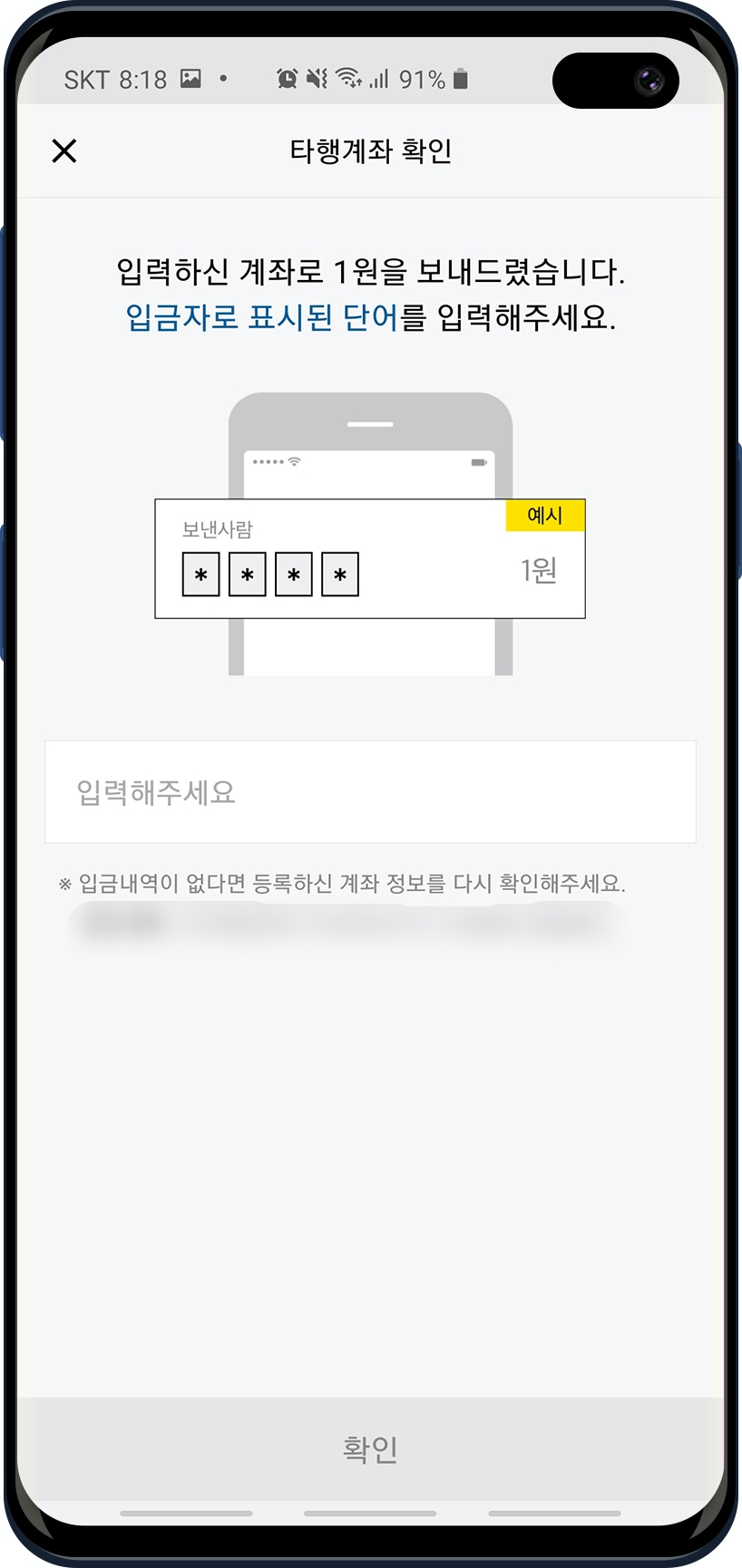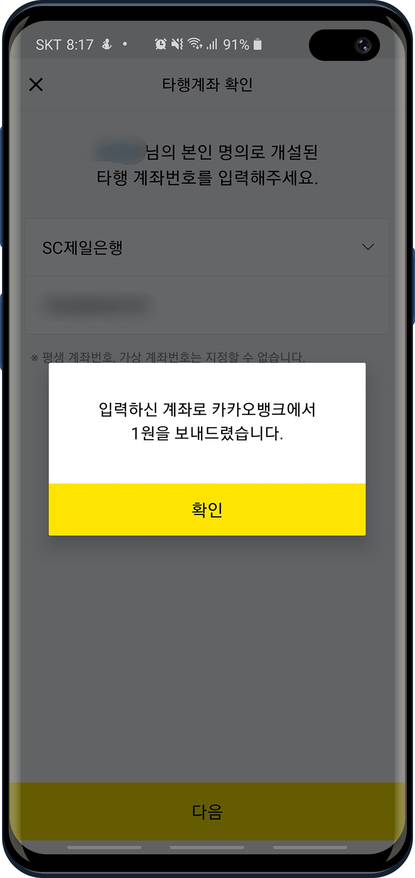 이제 추가로 선택했던 "다른 은행 계좌로 본인확인" 차례입니다. 방식은 카카오뱅크에서 가입자 명의로 개설된 은행에 1원을 입금합니다. 그 입금한 "입금자 명"을 확인하고 카카오뱅크에 그걸 입력하면 추가 본인인증이 완료됩니다. 전 SC제일은행으로 개설된 계좌를 입력했고 방금 카뱅에서 그 계좌로 1원을 송금했습니다. 확인해봐야죠.