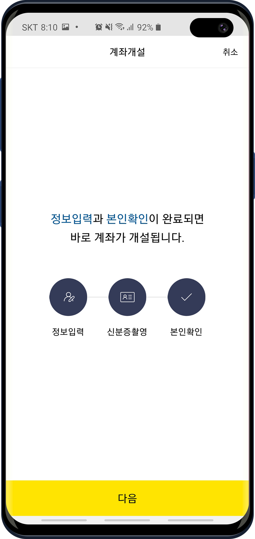 인증수단을 등록하면 그 뒤에는 정보입력과 본인확인을 진행합니다. 이절차가 끝나면 계좌 개설이 완료됩니다. 순서는 계좌의 정보등을 입력하고 신분증을 촬영과 타행 계좌에 1원을 이체해서 이름을 입력하는 방식으로 본인확인을 합니다.