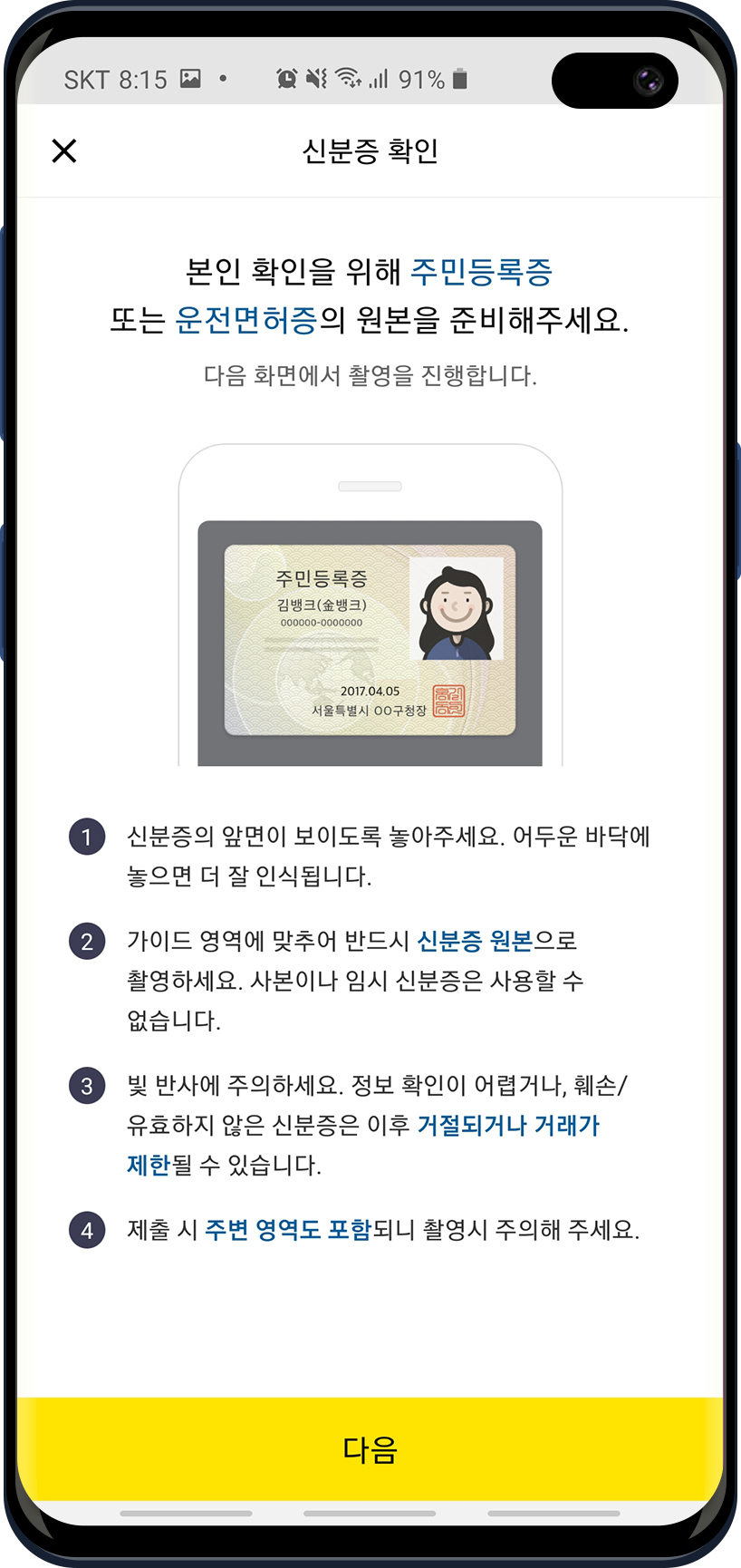 신분증의 앞면이 보이도록 바닥에 놓고 촬영을합니다. 빛 반사에 주의하고 정보 확인이 어렵거나 유효하지 않은 신분증은 이후 거절되거나 거래가 제한될 수 있습니다. 가이드 영역이 있으니 거기에 맞춰서 촬영을하면됩니다. 운전면허증으로 해봤는데 인식률은 매우 좋았습니다.