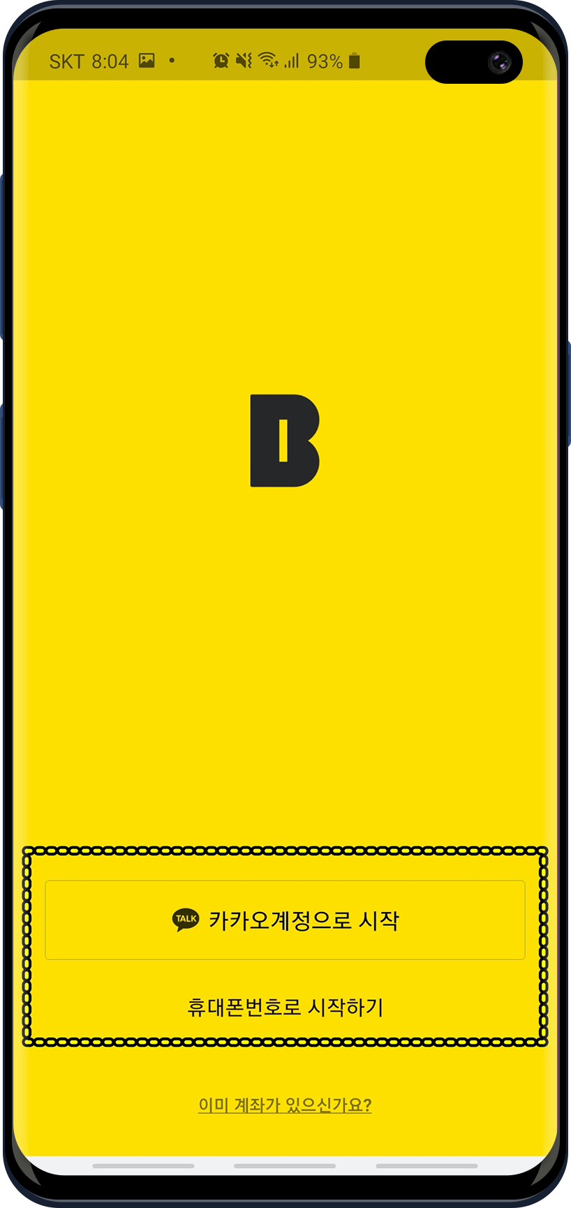 앱스토어나 플레이스토어에서 "카카오뱅크"를 검색해서 다운 받은후 설치 실행합니다. 카카오뱅크 앱을 실행하면 카카오 계정으로 시작할건지 휴대폰번호르 시작할지를 물어봅니다. 저는 그냥 카카오계정으로 시작했습니다.