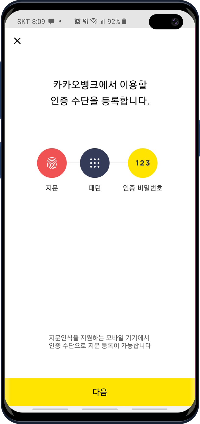 먼저 카카오뱅크에서 이용할 인증수단을 등록합니다. 지문, 패턴, 비밀번호 순서로 등록합니다. (지문인식은 지문인식을 지원하는 모바일 기기에서 인증 수단으로 등록이 가능합니다.)